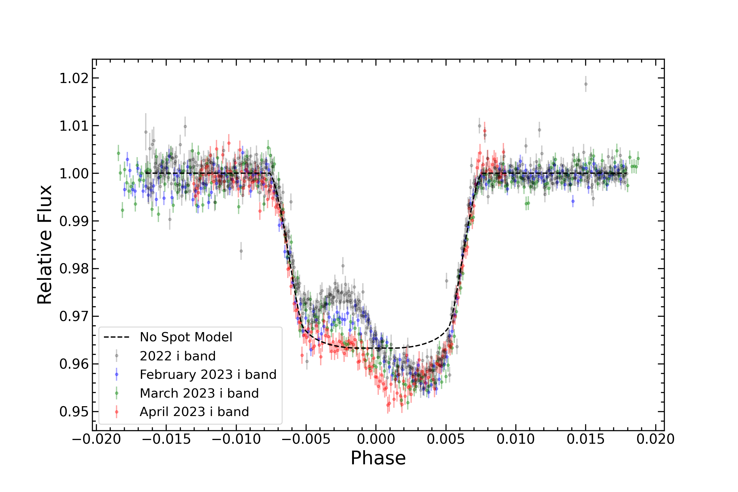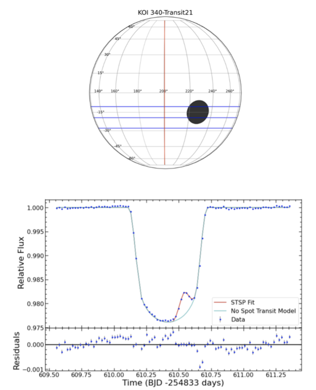 Recent Project and Papers | Starspot Modeling with STSPOver the past several years, I have been using a novel technique that allows for measuring the positions and sizes of starspots on the surfaces of distant stars. Since Sunspots are known to be the location of strong concentrations of magnetic fields on the Sun, individual starspots can be used as tracers of the underlying local magnetic fields on stars. I have completed the development of a modeling program called STarSPot, or STSP for short, designed to determine the latitude, longitude, and radius of small-scale starspots on any transiting planet host star that shows the effect of in-transit starspots. The program is based on the following concept: a transiting planet causes a dip in brightness in the light curve of a star when the planet passes in front of the star and blocks stellar light that would otherwise be observed. If the surface brightness of the star is not uniform due to magnetic surface features like cool starspots or hot plage, the in-transit light curve will not be smooth and symmetric. An increase in brightness that appears as a ``bump'' in the bottom of the transit indicates that the planet is briefly blocking less light from the star because it is crossing in front of a starspot that is cooler and, thus, darker than the surrounding surface. Importantly, the precise knowledge of the planet's position (as derived from the shape and timing of the transit light curve) provides specific positional information about the spots in the path of the planet. |