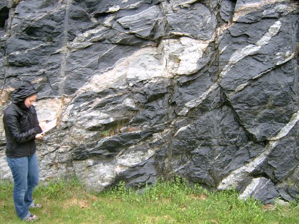 Stop 3. Popple Hill Gneiss. This outcrop is only a km or two down the road, but is worlds apart in composition and metamorphic grade.
